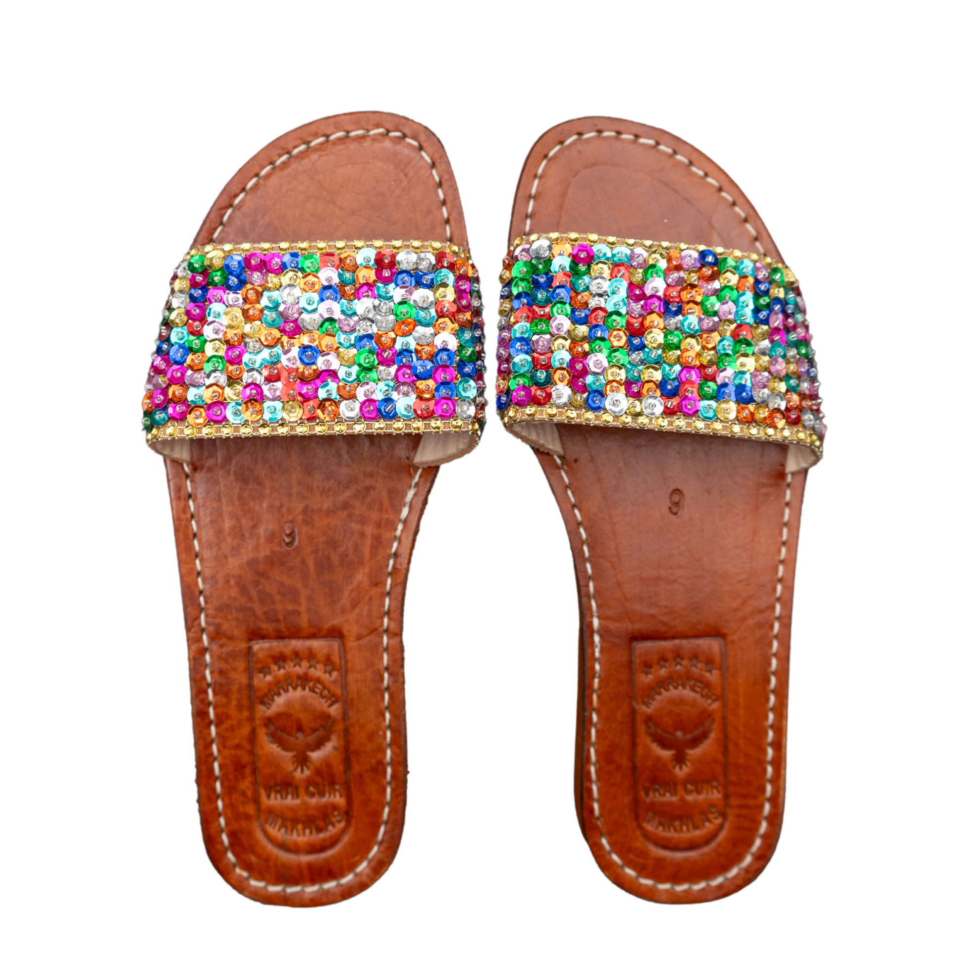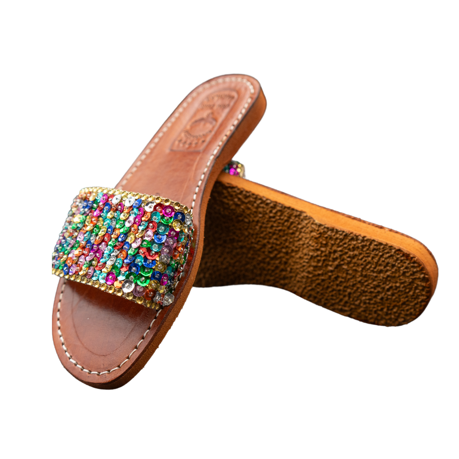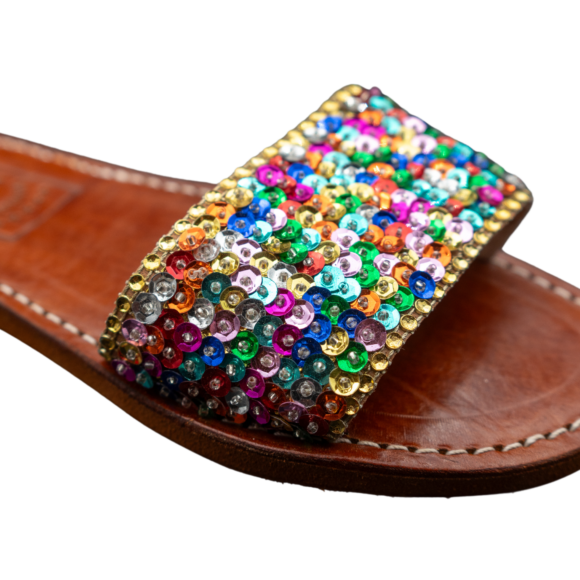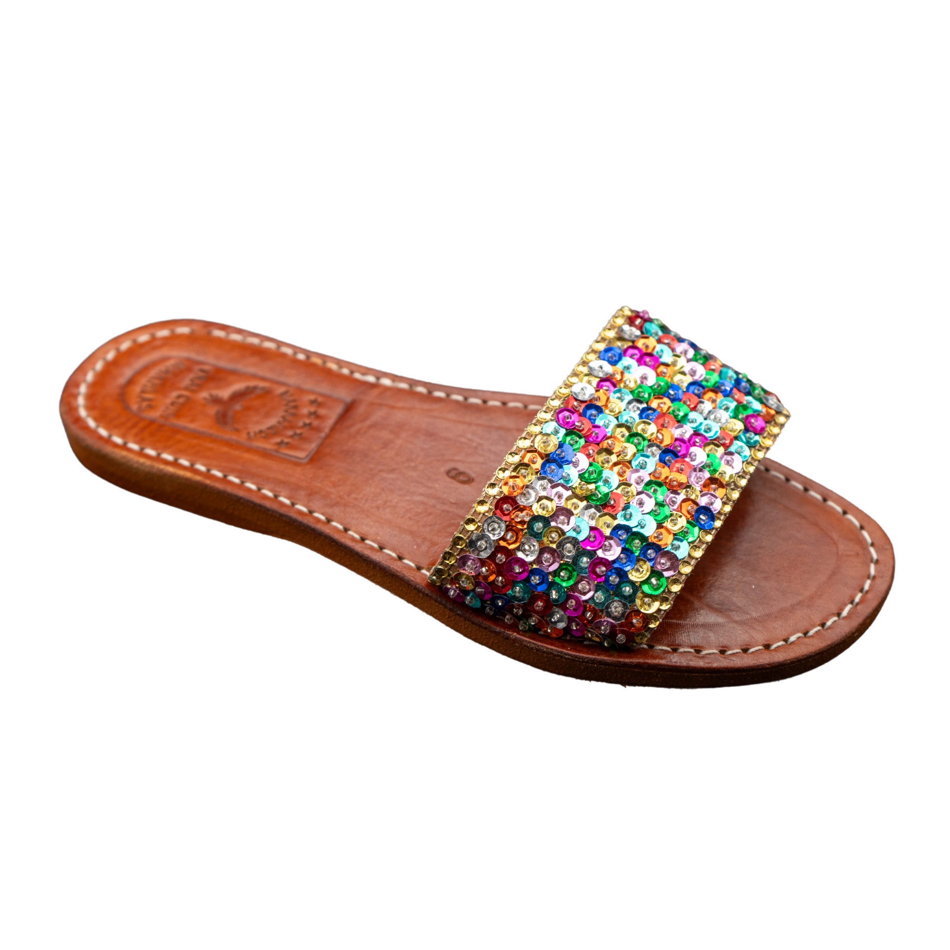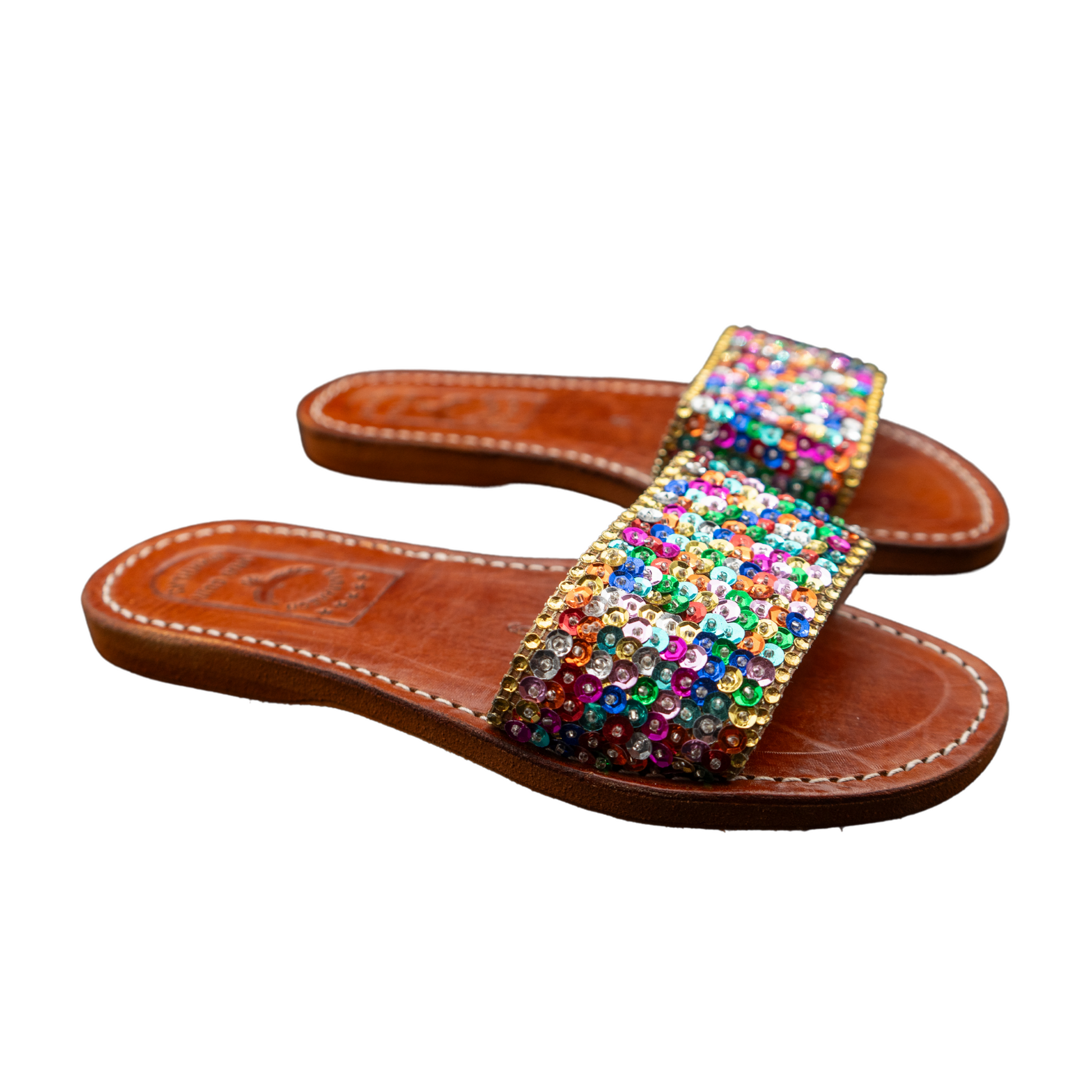 Sandales plates en strass, à une sangle, décontractée et chic.