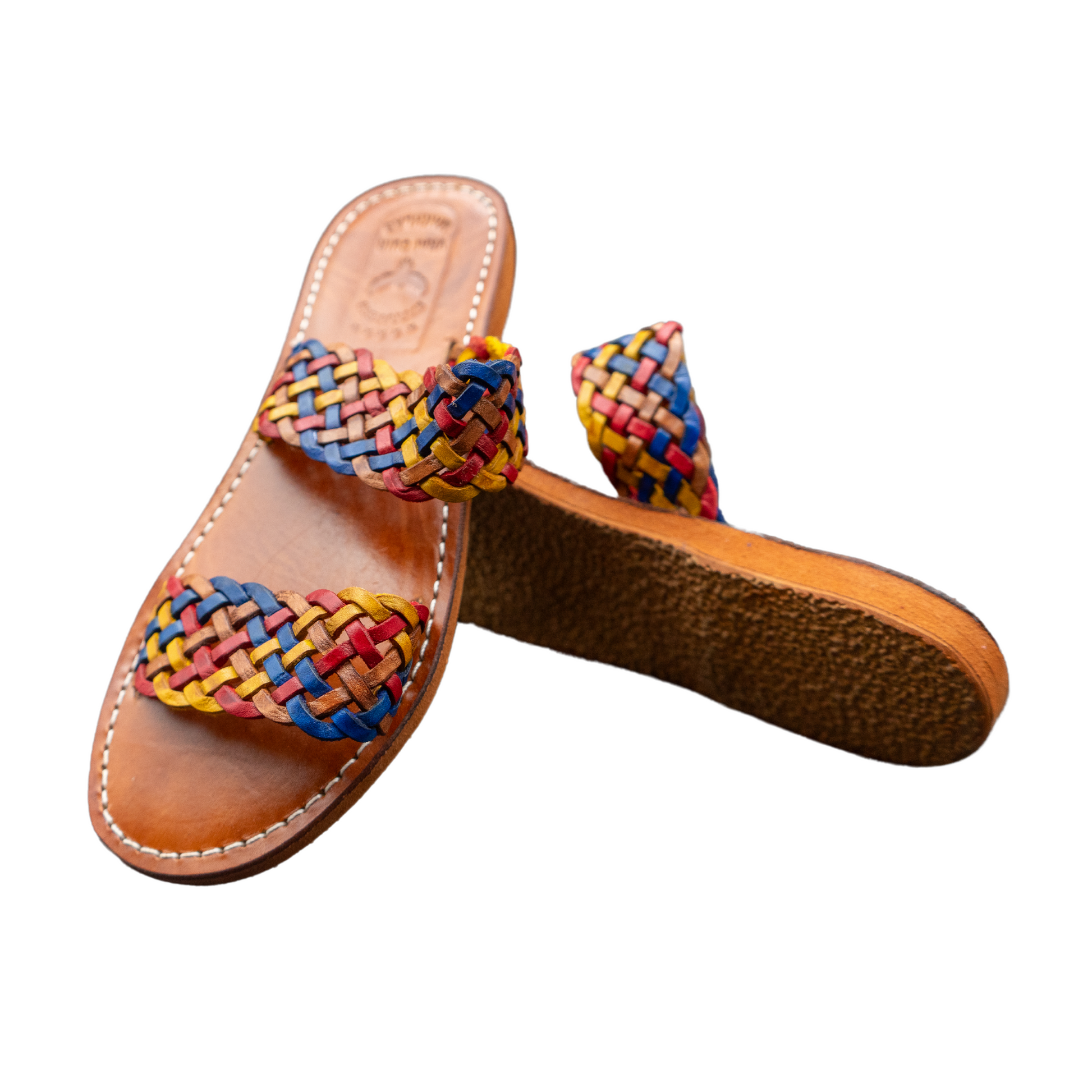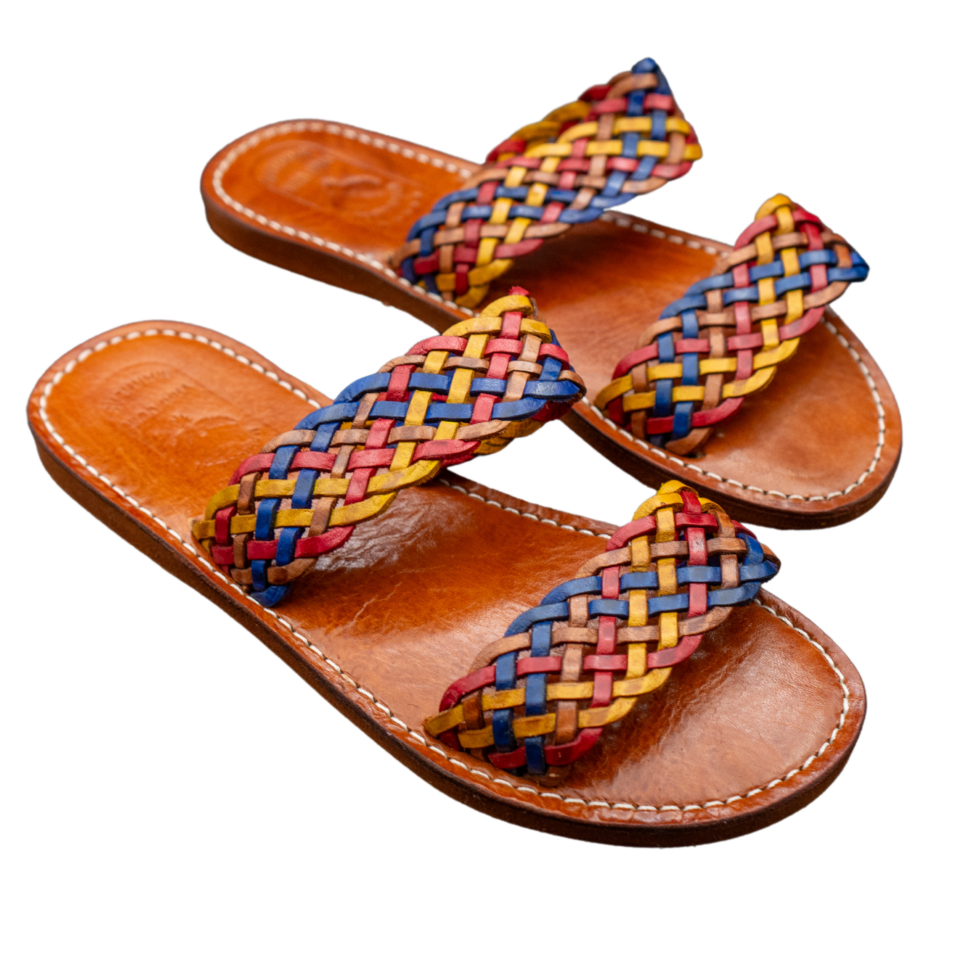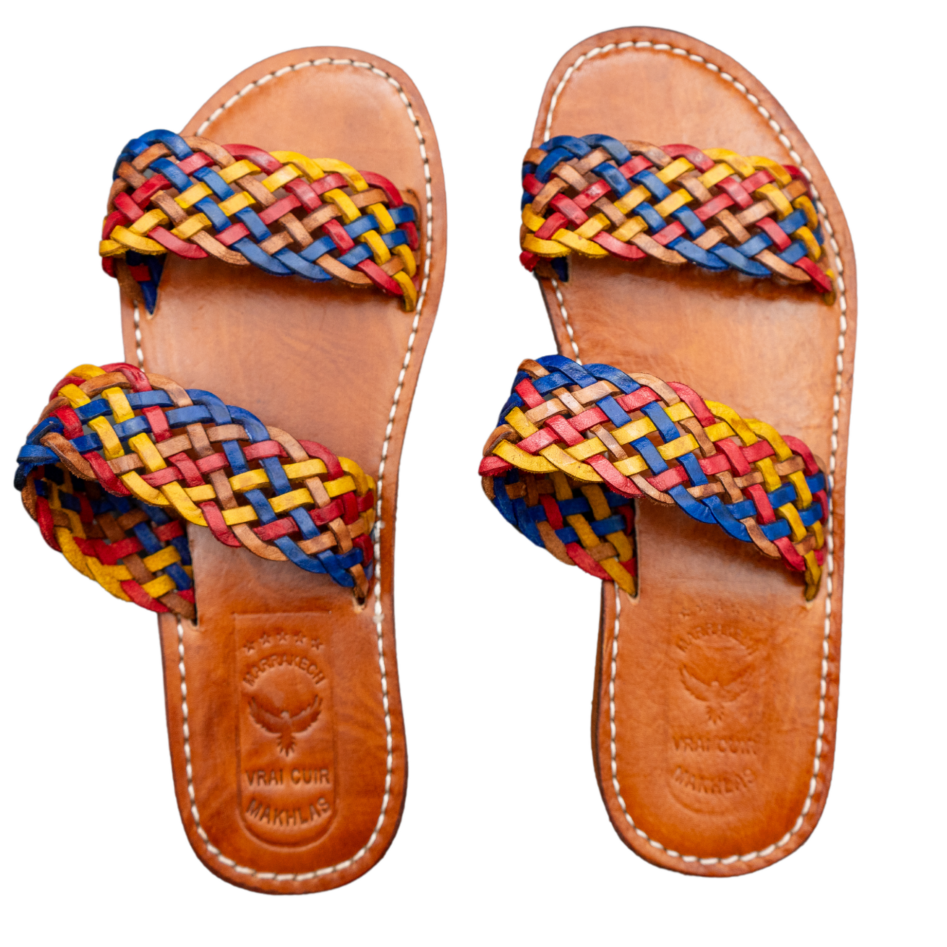 Sandales plates élégantes en cuir, colorées, à deux sangles tressées, à la mode.