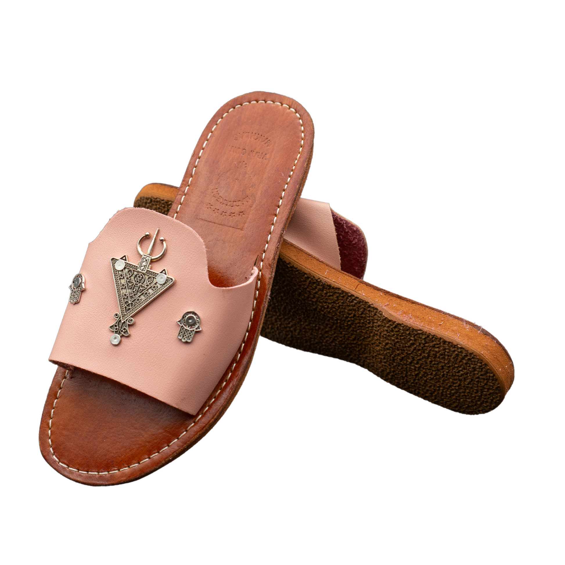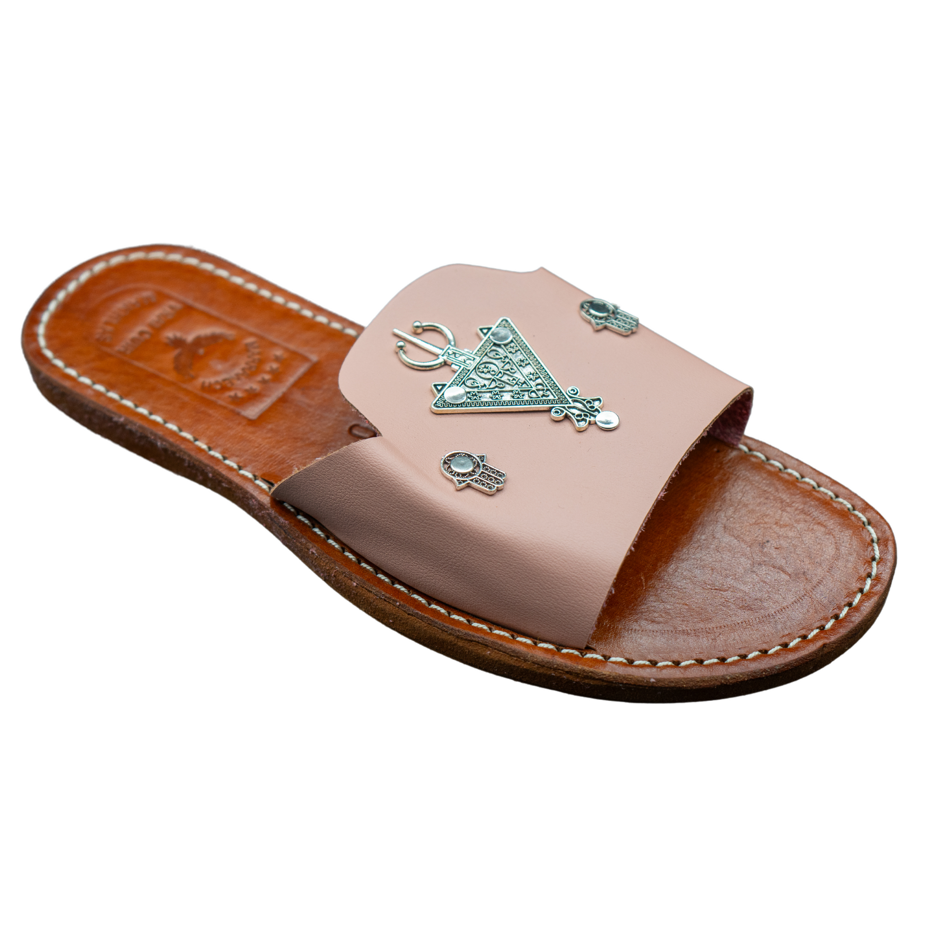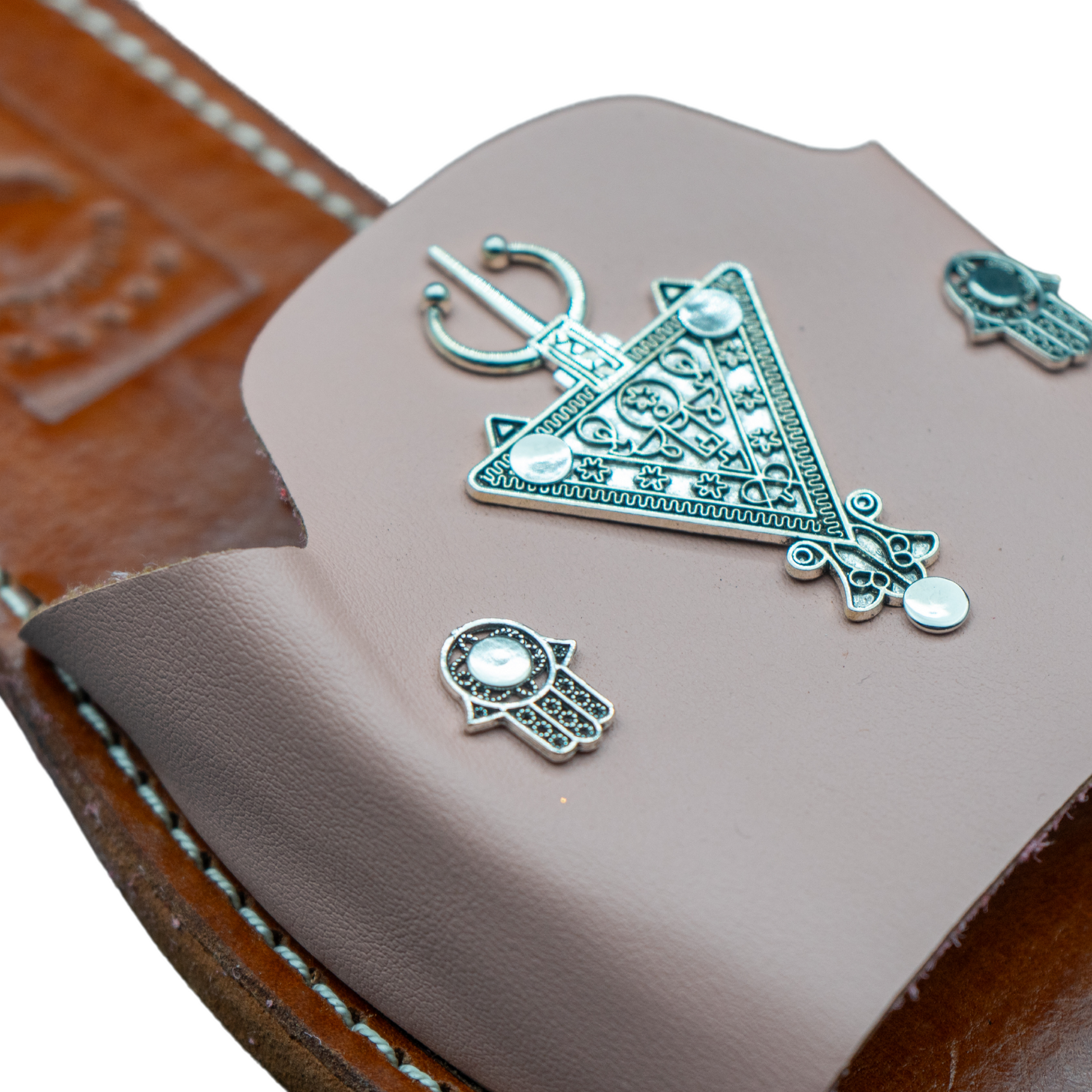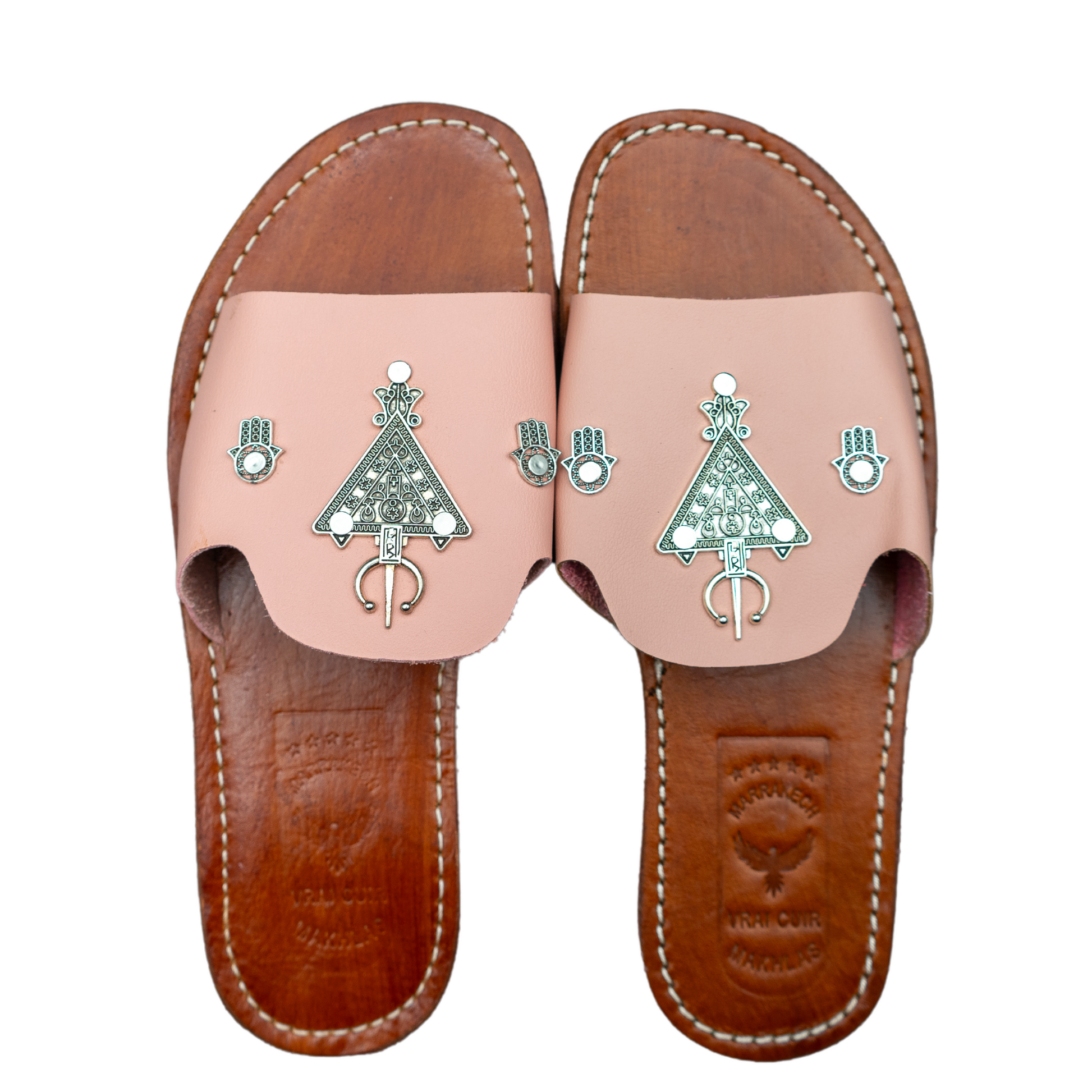 Sandales artisanales marocaine en cuir, chic et élégantes, symbole main de fatma et La Croix berbère, idéal pour les petites ballades.
